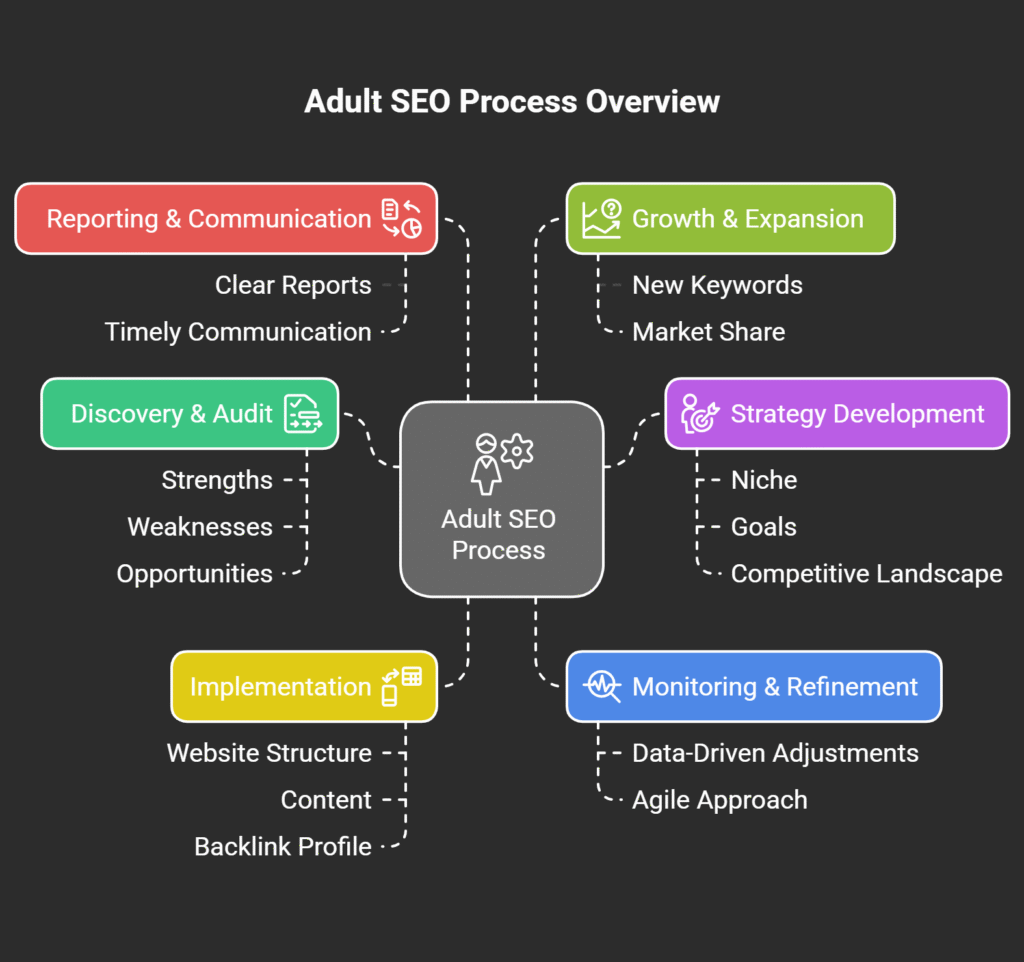 We follow a systematic approach to adult SEO that addresses the unique challenges of the industry while maximizing results. Our process is transparent, data-driven, and focused on delivering measurable improvements to your website’s performance.